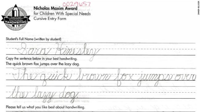 Sara, who had learnt to write in neatly cursive sample, has earned the Nicholas Maxim Award in the 2019 Zaner-Bloser National Handwriting Contest.