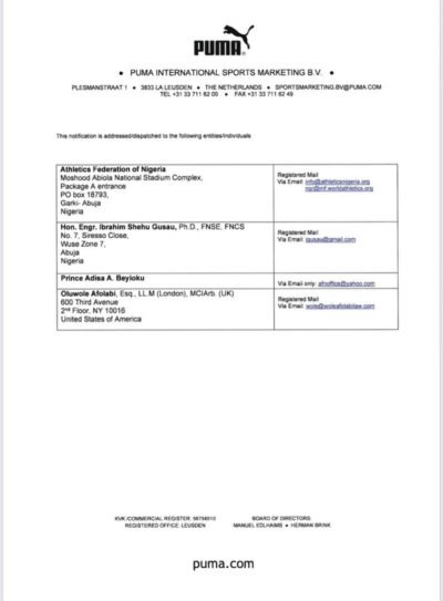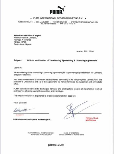 The Puma letter, dated August 4, explained that the premature termination of the contract is due to the inability of Nigerian athletes to wear the brand at the ongoing Olympics.