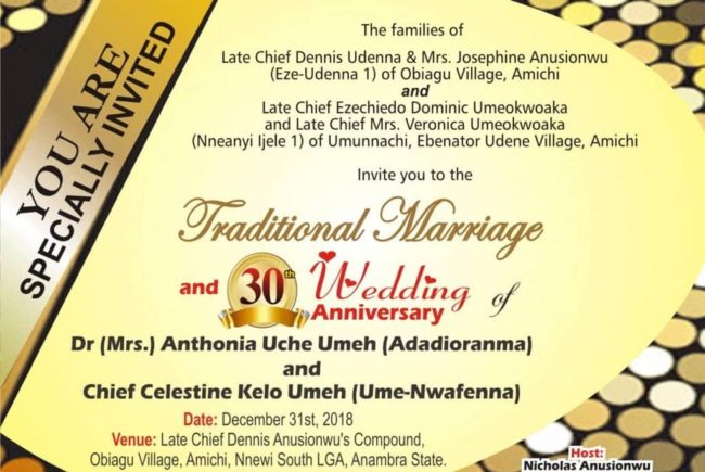 The Umeh clan of Amichi Town, Nnewi South LGA, Anambra State had another reason to celebrate recently, as the beautiful and delectable Dr (Mrs.) Anthonia Uche Umeh (Adadioranma) and her groom, Chief Celestine Kelo Umeh (Nwafenna Amichi) celebrated their traditional marriage ceremony. It was double celebration for the couple, family, friends and well wishers, as the occasion also marked their 30th Wedding Anniversary.