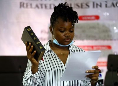 Rinu Oduala swears by the Bible during a Judicial panel investigating police brutality and shooting of protesters in Lagos