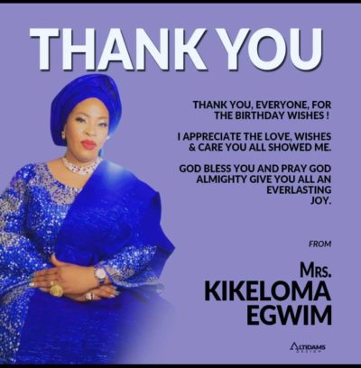 Hon Mrs Kikelomo Egwim has thanked wellwishers who celebrated her on the occassion of her birthday.