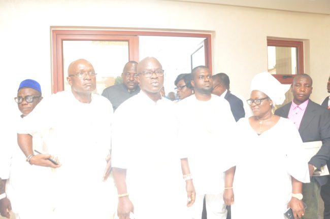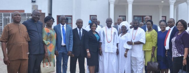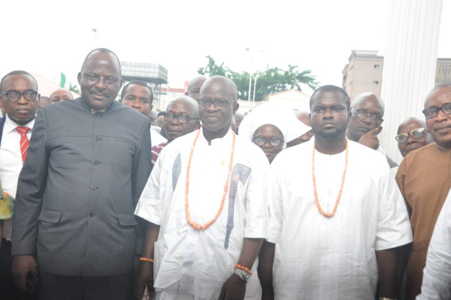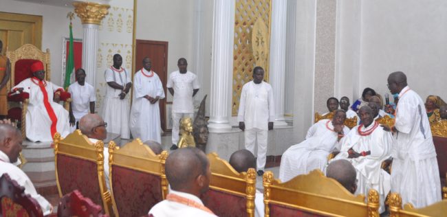 Edo State Head of Service, Mr. Isaac Ebose Ehiozuwa (middle), with other members of his entourage, during his courtesy visit to the Oba of Benin, His Royal Majesty, Omo N’Oba N’Edo Uku Akpolokpolo, Oba Ewuare II, at the Palace in Benin City, Edo State.