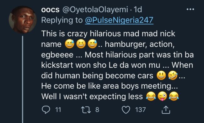 “This is crazy hilarious mad mad nick name 😅😆😅.. hamburger, action, egbeeee … Most hilarious part was tin ba kickstart won sho Le da won mu … When did human being become cars 😃🤣… He come be like area boys meeting… Well I wasn’t expecting less”