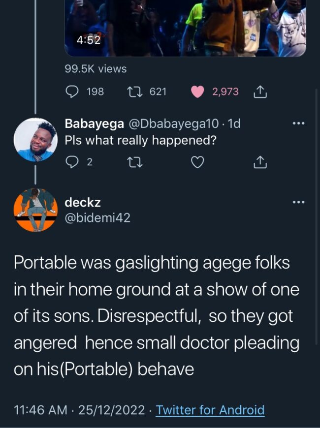 “Portable was gaslighting agege folks in their home ground at a show of one of its sons. Disrespectful, so they got angered hence small doctor pleading on his(Portable) behave”