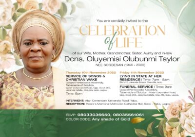The family of Deaconess Oluyemisi Olubunmi Taylor (Nee Sogbesan ) has announced the burial arrangement of their matriarch who died on the 5th of October at the age of 75. She was born in 1946.
